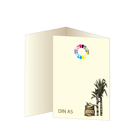 Die Faltblätter DIN A5, wahlweise aus 90g, 150g oder 200g starkem Zuckerrohrpapier (das entspricht einer herkömmlichen Papierstärke von 110g, 180g oder 250g), überzeugen durch eine leicht cremige Papierfärbung und schöne Haptik.